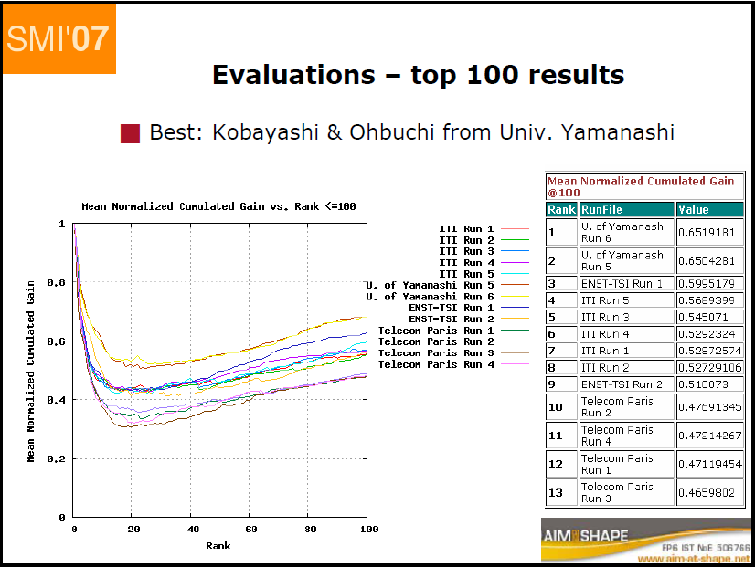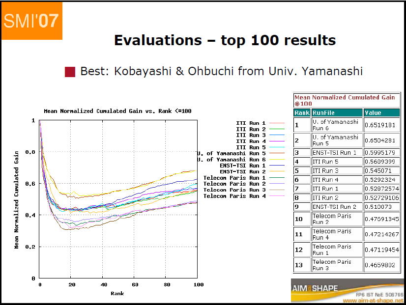 Mean Average Precision(relevant) Rank RunFile Value 1 U. of Yamanashi Run 6 0.43371364 2 U. of Yamanashi Run 5 0.43185356 3 ENST-TSI Run 1 0.3787826 4 ITI Run 4 0.33206695 5 ITI Run 3 0.32480213 Jun Kobayashi, Akihiro Yamamoto, Toshiya Shimizu, Ryutarou Ohbuchi, A database-adaptive distance measure for 3D model retrieval, SHREC 2007 CAD track paper, SMI 2007, June 2007 (PDF)