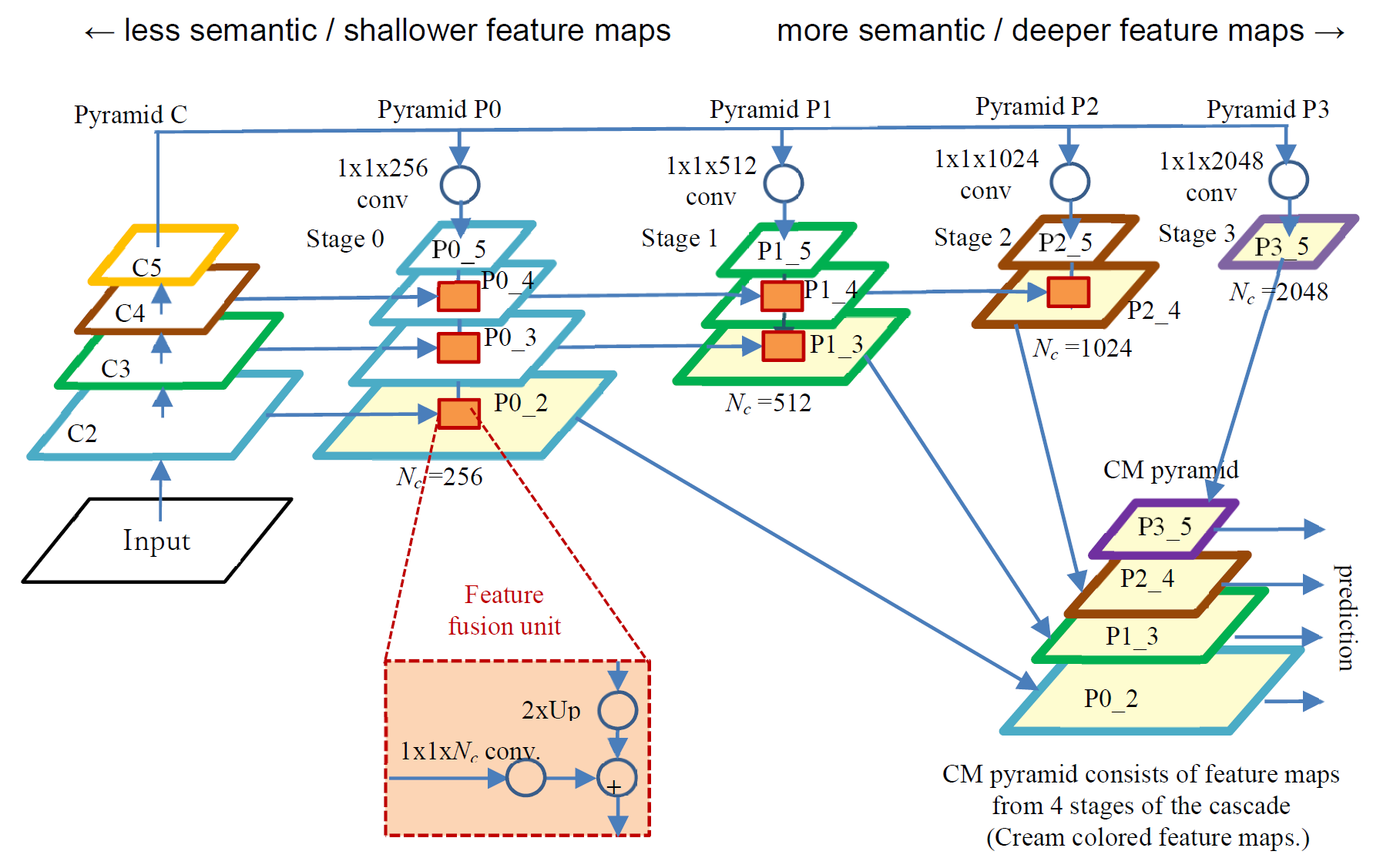 We propose and evaluate a novel object detection architecture called Cascaded Multi-Channel Feature Pyramid Network, or CM-FPN. The proposed network, which is based on Feature Pyramid Network by Lin et al., employs multi-stage cascaded top-down feature pyramid networks to extract more semantic multiresolution feature maps for object region proposal and object classification.
