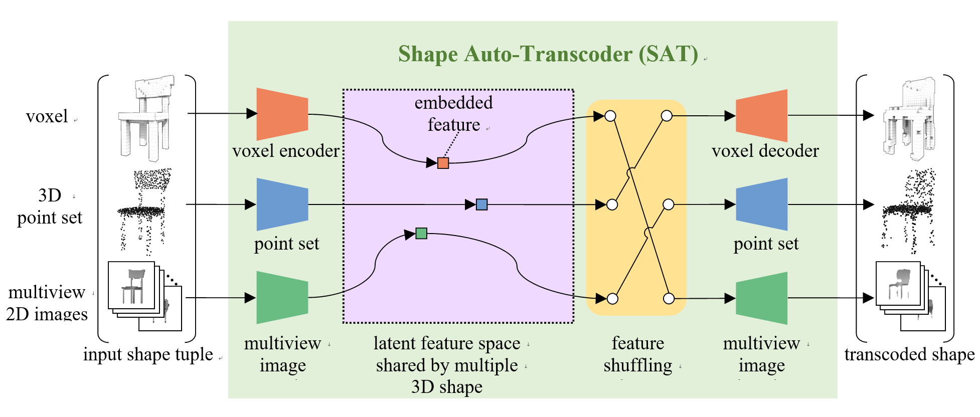 This paper presents a novel unsupervised deep representation learning algorithm for 3D shape feature. The approach employs transcoding across multiple shape representations, e.g., across polygonal meshe, point set, and voxel representation