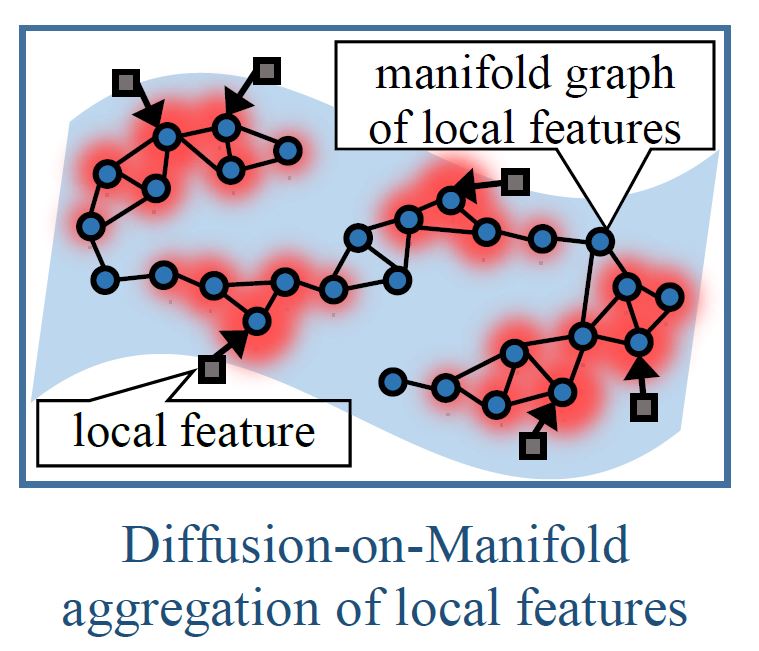Aggregation of loca features has a large impact on accuracy and cost of object recognition in or retrieval of images or 3D shape models. Classic bag-of-words or bag-of-features approach has been followed up by such methods as Vector of Locally Aggregarted Descriptor (VLAD), Fisher Vector (FV) coding, Super Vector (SV) coding, or Locality-constrained Linear Coding (LLC). We propose a new feature aggregation method called Diffusion-on-Manifold (DM) that exploits structure of potentially non-linear manifold of local features.