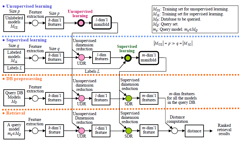 手法はこの論文に書かれています.教師無し学習を用いて多数の3次元モデルの特徴から,これら特徴の張る部分空間を学習し,その部分空間の測地線距離を用いる方法です.基本的なアプローチについてはこのMIR2006の論文に書かれています.