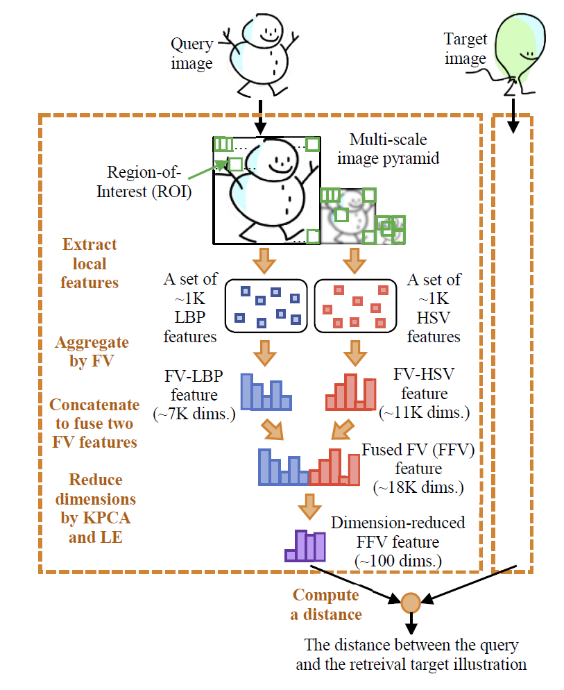 描画スタイルに基づく画像検索のための,局所視覚特徴量と教師なし距離計量学習を組み合わせた手法を提案します.数千枚のイラスト画像を含むベンチマークで評価した結果,大域視覚特徴量と教師あり学習を用いる従来手法よりも,検索精度が向上しました.