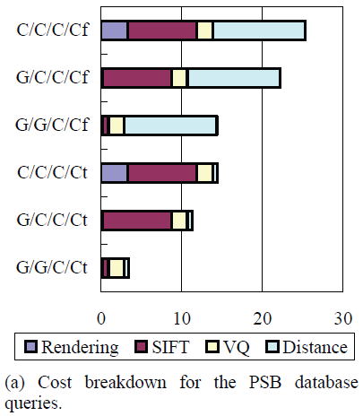 We accelerated some of the steps for the Bag-of-Features SIFT algorithm for 3D model retrieval (Ohbuchi_SMI08) we have published at the SMI 2008. We adopted Wu's algorithm for GPU-based SIFT feature extraction and table lookup for distance computation for a significant speedup without degradation in retrieval performance.