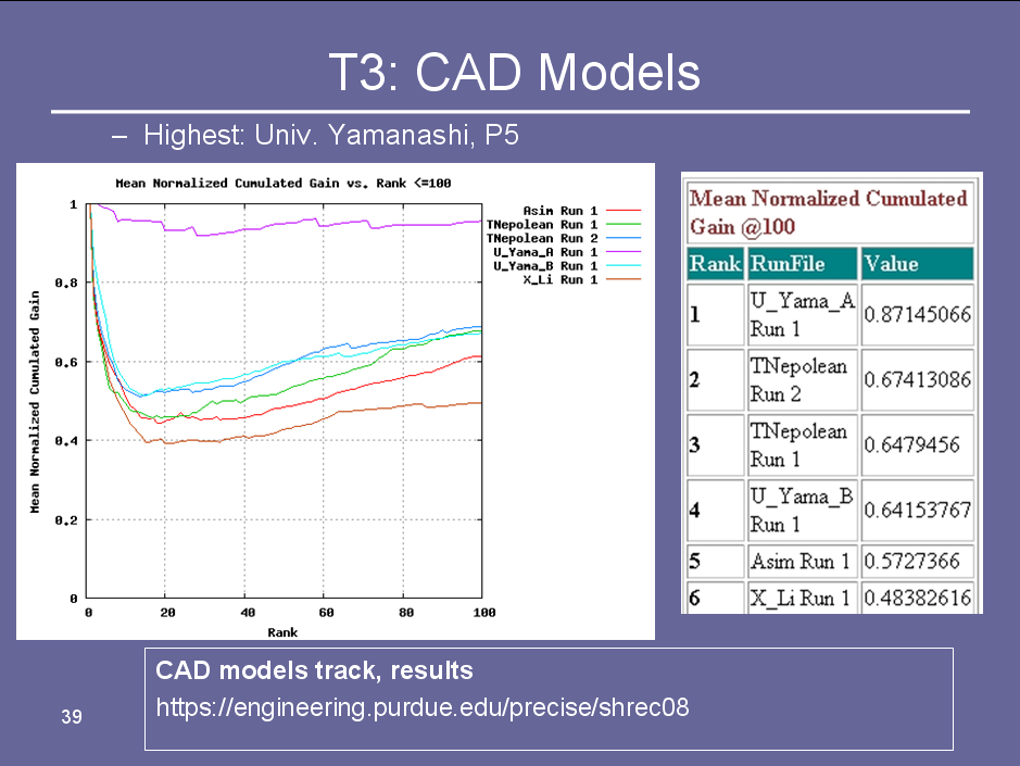 We won the SHREC 2007 (Shape Retrieval Contest) CAD model track. Our method won the competition by a significant margin, as the result shows.