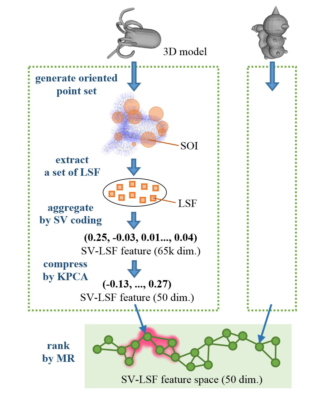 We combined our LSF 3D local statistical shape feature, aggregated by using Super Vector Coding, with (single-domain) unsupervised similarity metric learning by using Manifold Ranking by Zhou, et al.