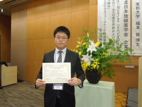 大学院修士課程工学専攻コンピュータ理工学コース1年の中島啓太さん(指導教員:安藤英俊 工学部准教授,共同研究教員:早川正幸 副学長・理事,山村英樹 生命環境学部准教授)が,第33回日本放線菌学会大会 (平成30年9月12日,武蔵野大学有明キャンパス)において,ポスター賞を受賞しました.