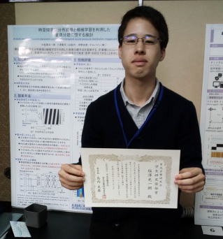 受賞した中島さんは,「この度はこのような賞を頂き大変嬉しく思います.指導教員の安藤先生をはじめ,共同研究者として貴重なアドバイスを頂いた山村先生,早川先生に感謝します.今回の受賞を励みに今後も研究に努めたいと思います.」とコメントしています.
